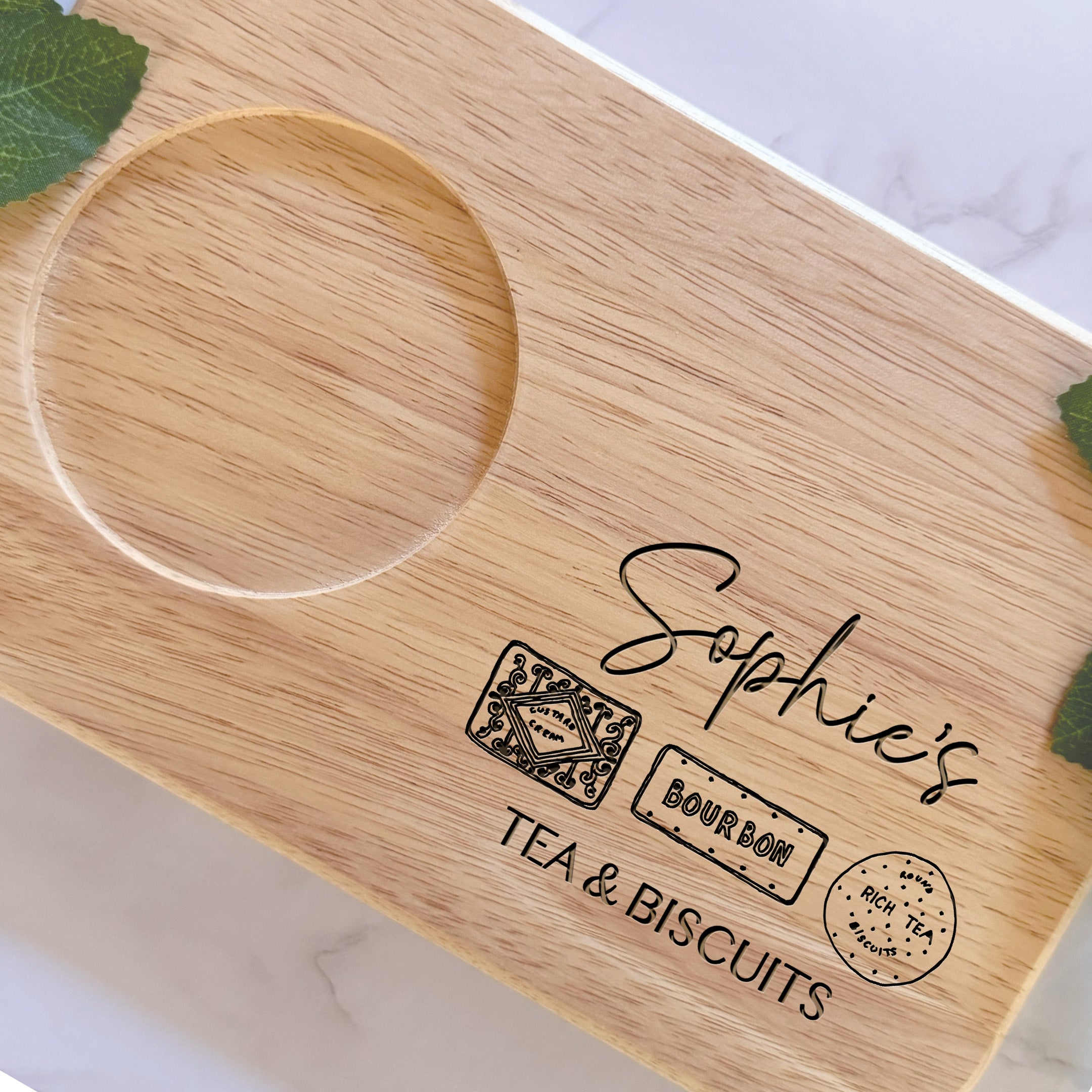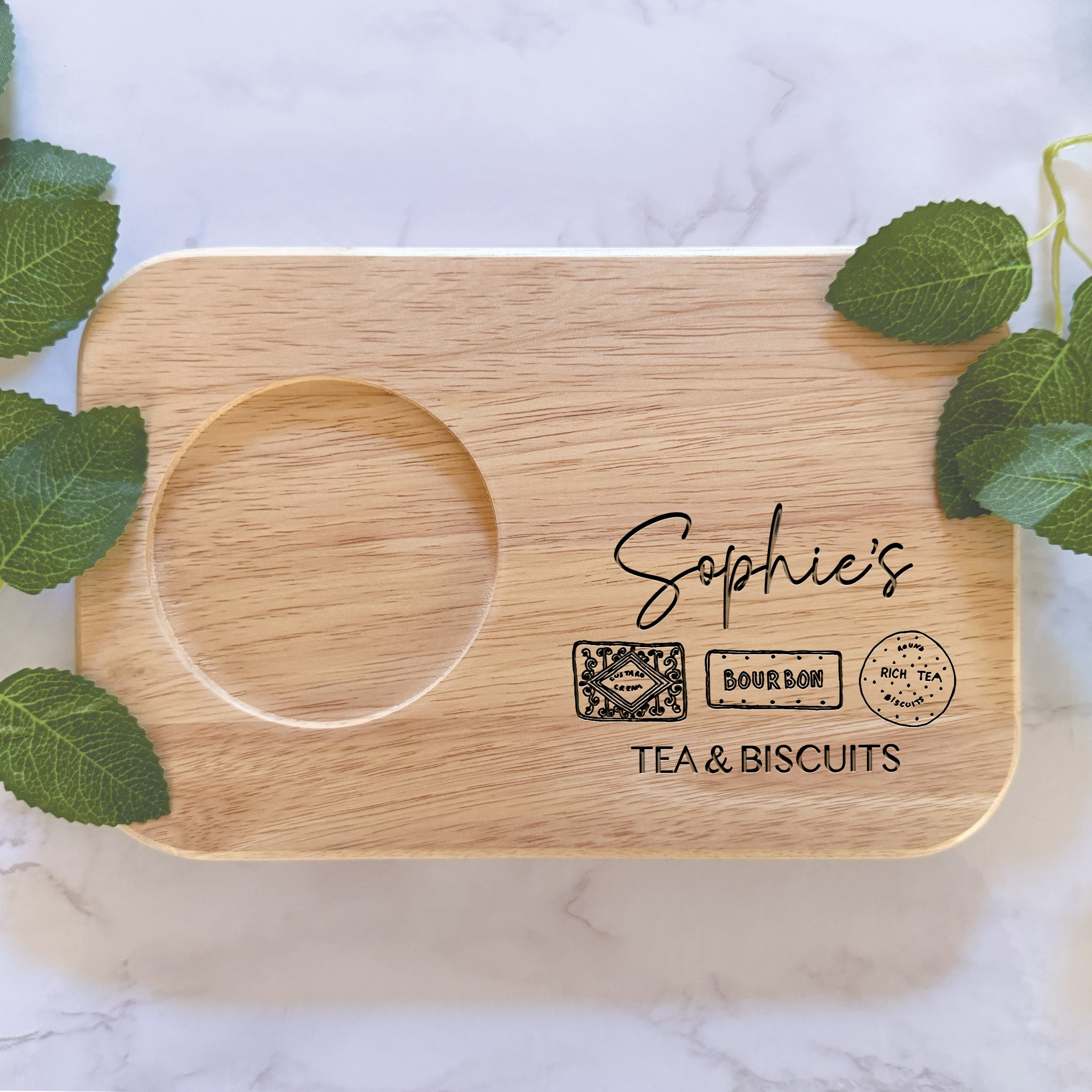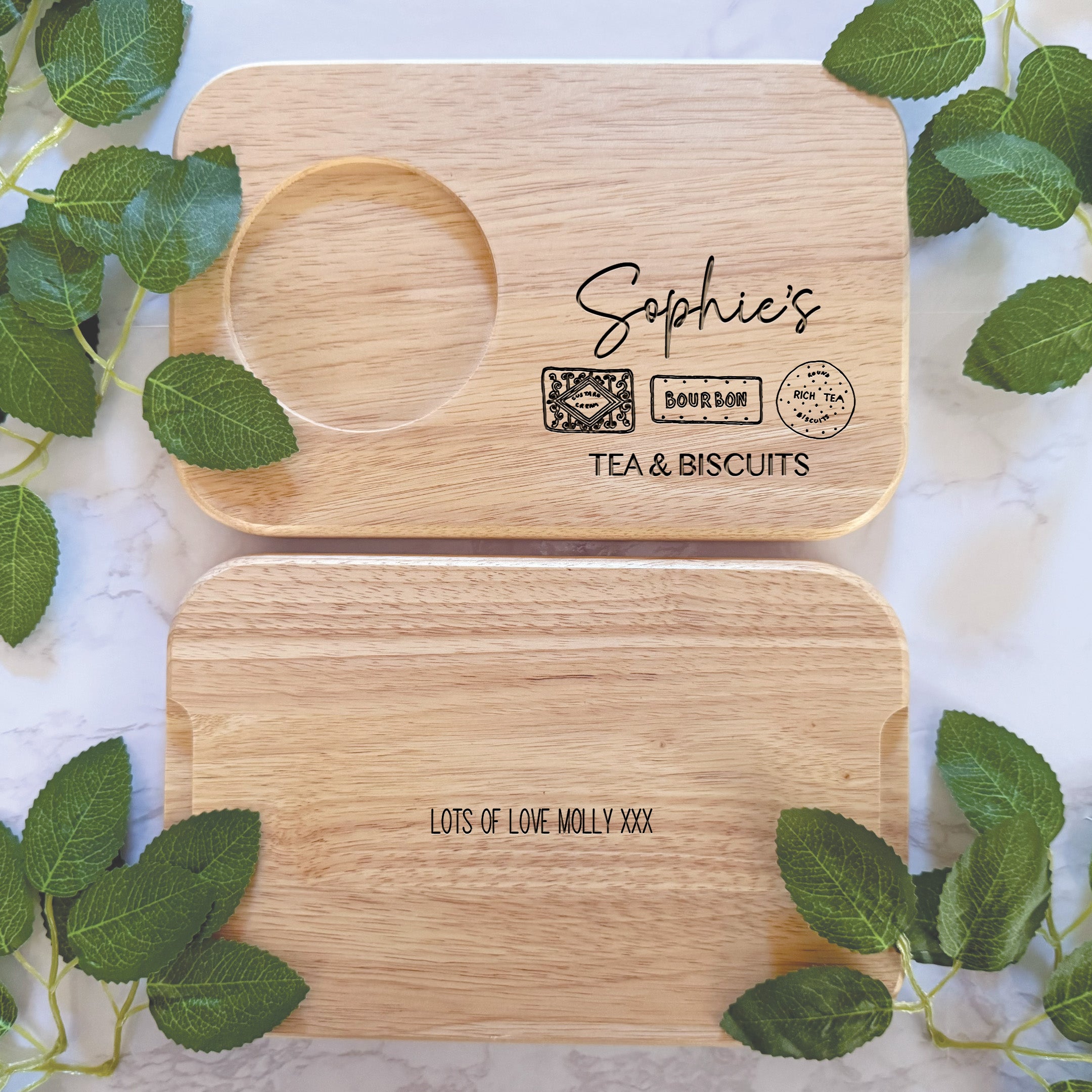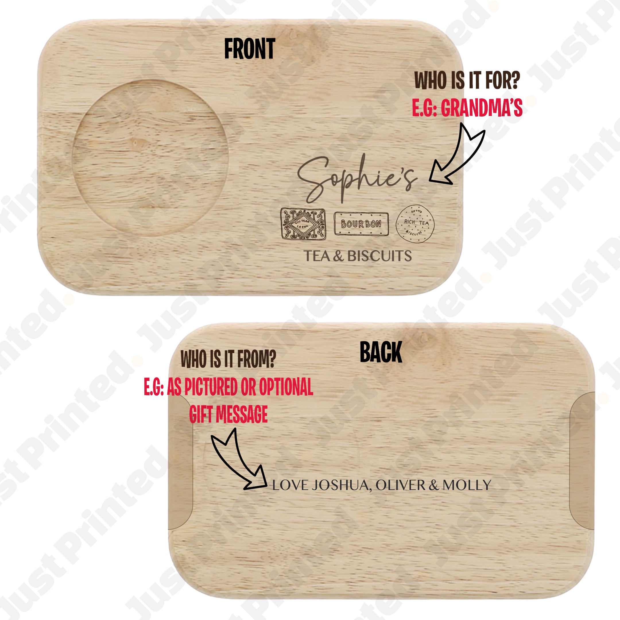 Our wonderful Personalised Engraved Wooden Tea and Biscuit Board adds a charming rustic touch to any kitchen. Crafted from natural wood, it’s ideal for both food preparation and serving. The board features the engraved name of your choice, along with a beautifully laser-engraved selection of hand-drawn classic biscuits—a perfect gift for any tea or coffee lover.