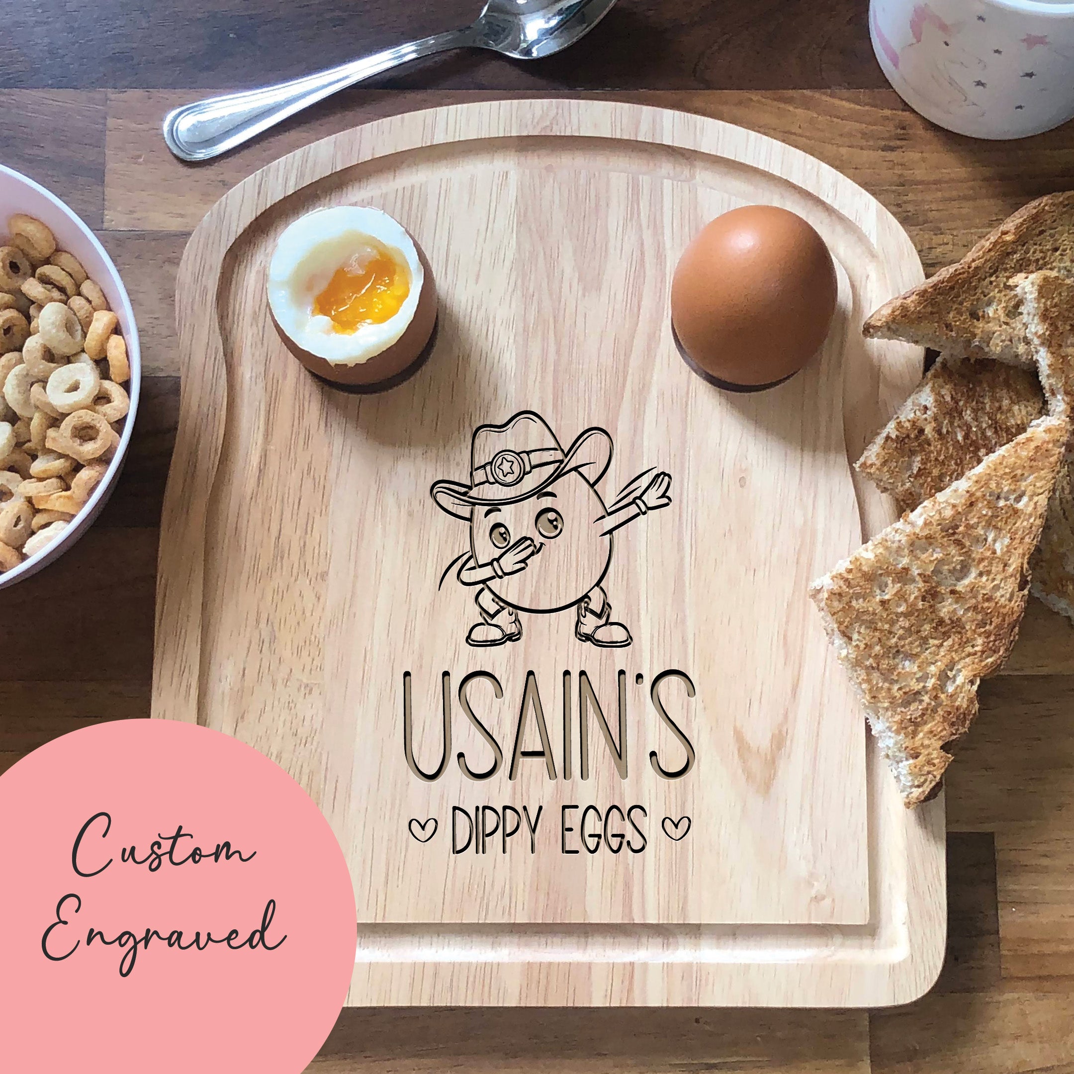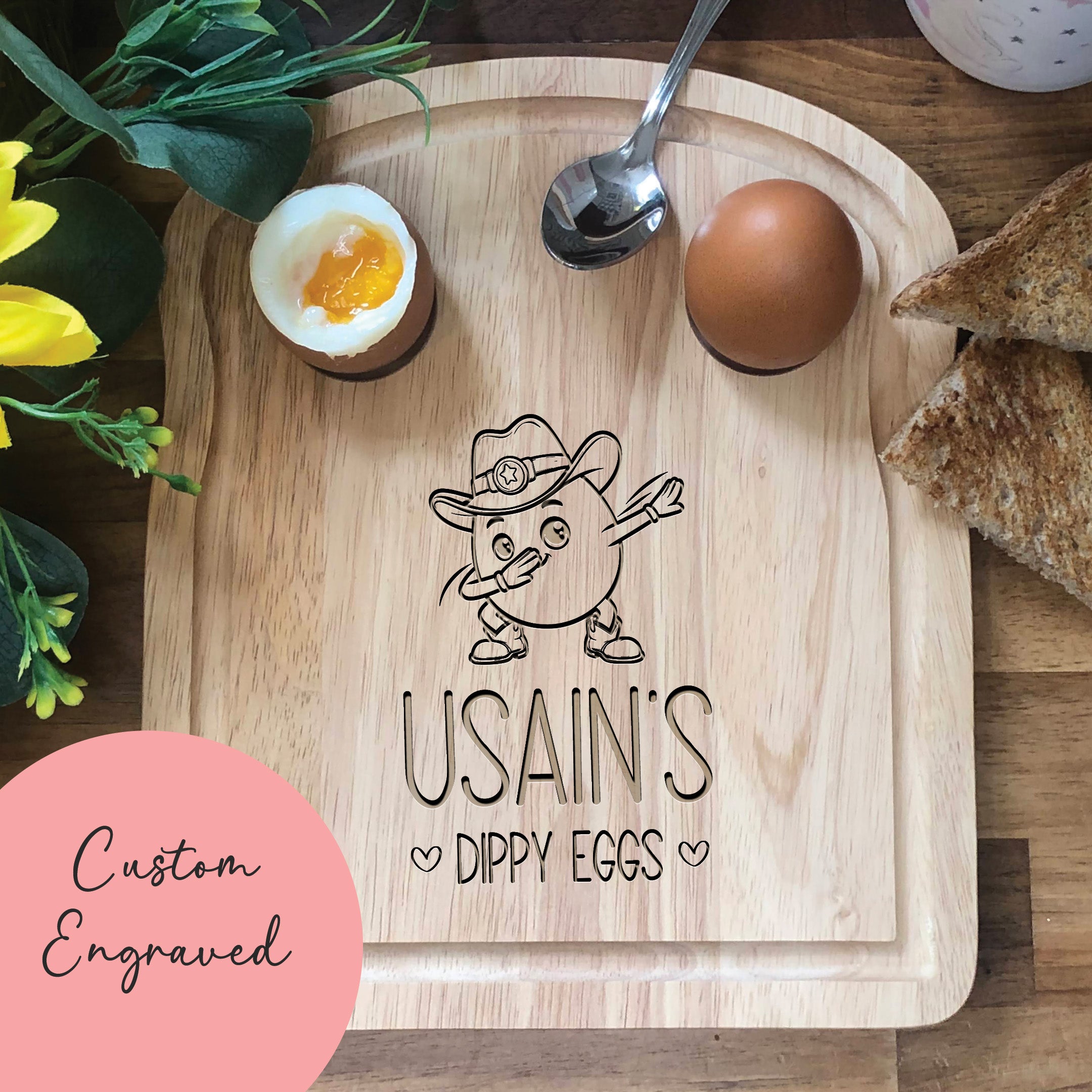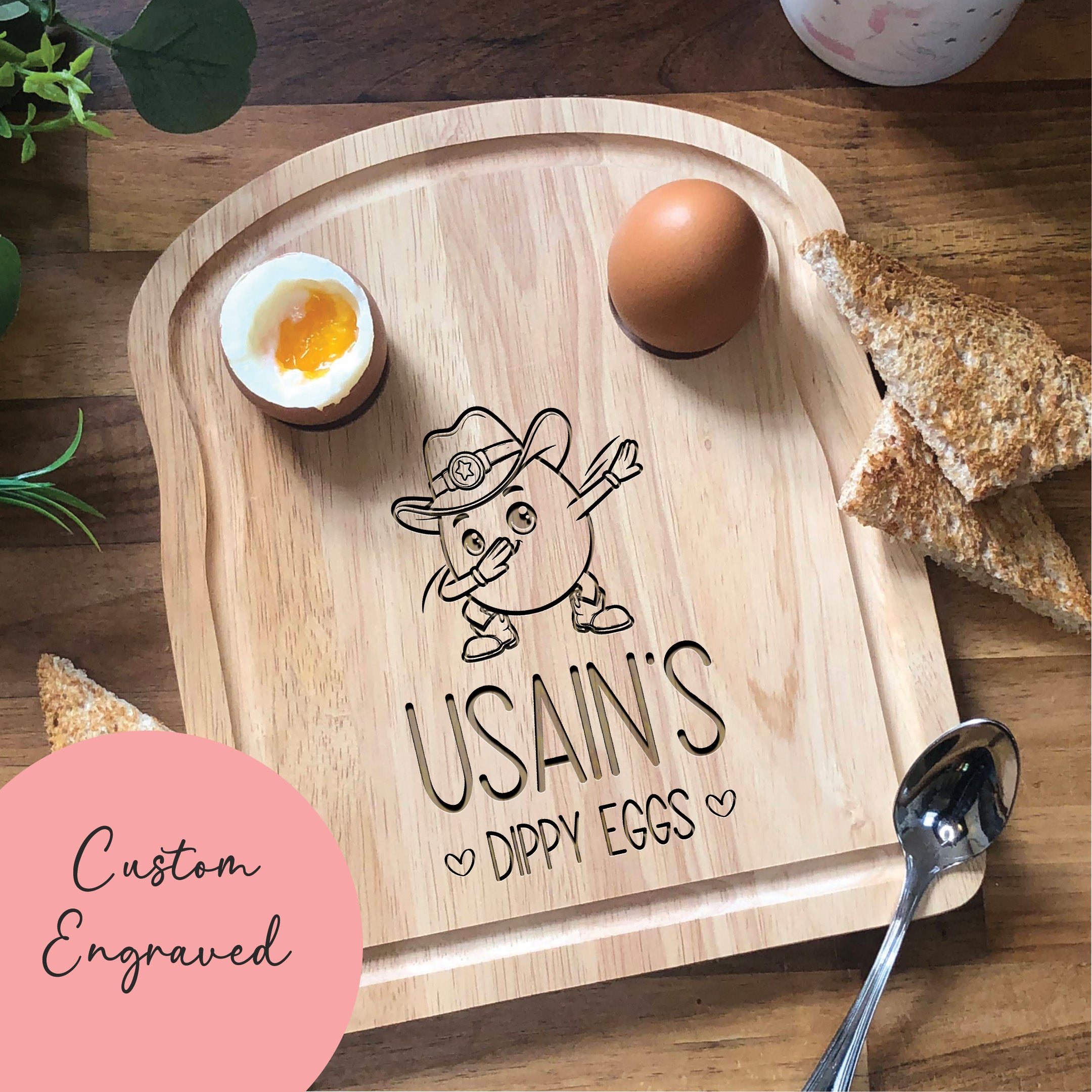 Designed with two egg holders and a groove along the edge to catch crumbs, this egg board is shaped like a large slice of bread, making it the perfect personalised gift for kids who love breakfast and Dippy Eggs!