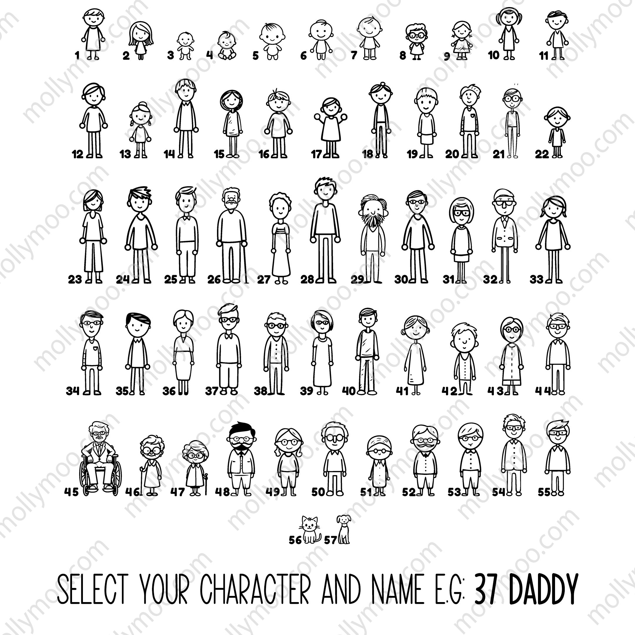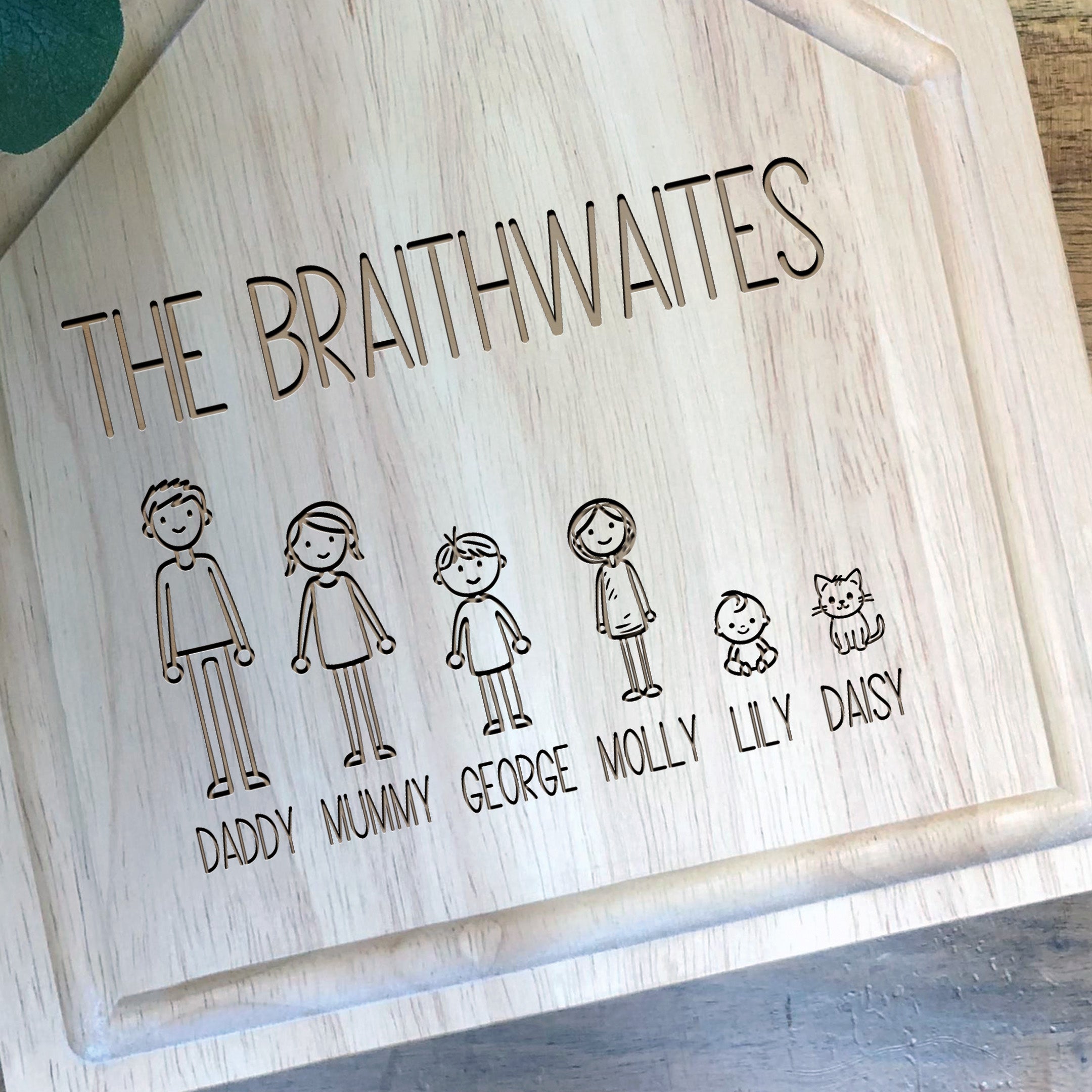 You can personalise this chopping board with a title whether that be family name or something else and then you can select your family members from the instruction image. Basically you choose the stick figure and then add the corresponding name for each. See personalisation instructions for more info. Of course any queries please reach out to us. We are always happy to assist however we can.